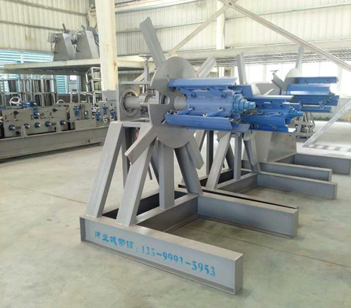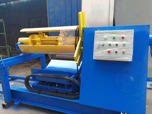 Machine de déroulement hydraulique avec chariot à bobines pour machine de formage de panneaux de toiture