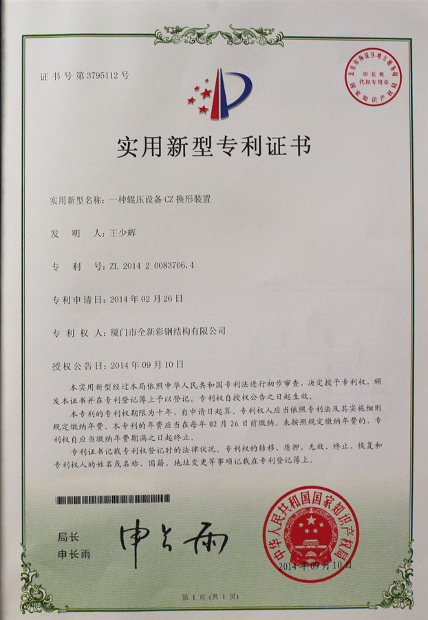Certificat de brevet de la machine de formage de rouleaux interchangeables CZ